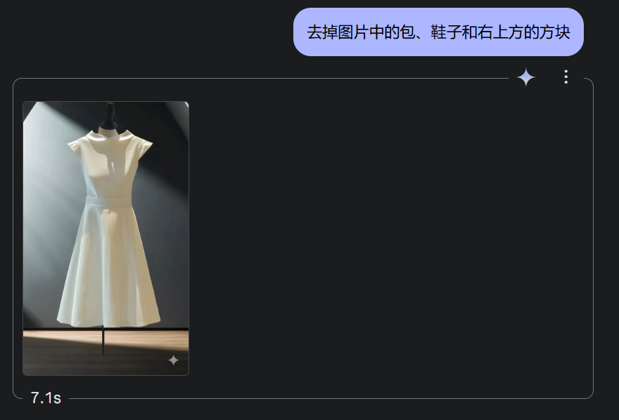 首先,我从网上下载了一张裙子的图片,但图片中有一些多余的元素,比如包和鞋子。我直接对 Gemini 说:“去掉图片中的包、鞋子和右上方的方块。”几秒钟后,AI 就生成了一张干净的裙子图片。