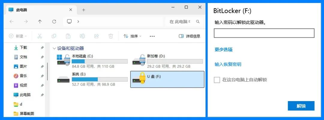 另外,还可勾选“在这台电脑上自动解锁”,这样本次成功解锁后,电脑会记住该U盘,以后其每次插入电脑均会自动解锁,可直接使用。