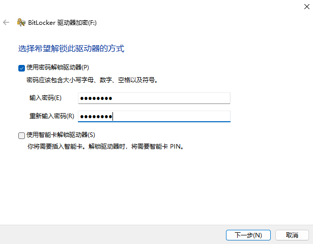 使用密码解锁驱动器,设置一个简短易记的解锁密码,使用U盘时既可输入解锁密码也可输入恢复密钥解锁。此项必须勾选设置,否则加密后的U盘就只能用恢复密钥解锁,而恢复密钥是一个48位的数字串,既不方便记忆,输入也冗长,失去了简单快捷的意义。下面会有更详细的讲解。
