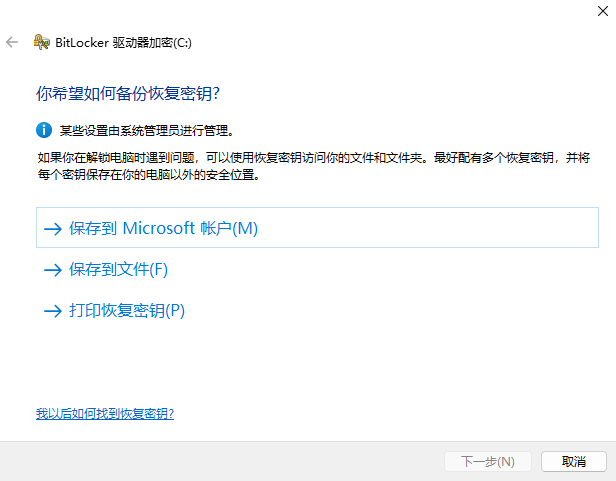 启用Bitlocker必须导出Bitlocker密钥,不导出无法继续操作,具体导出的细节将在下面另行讲解。