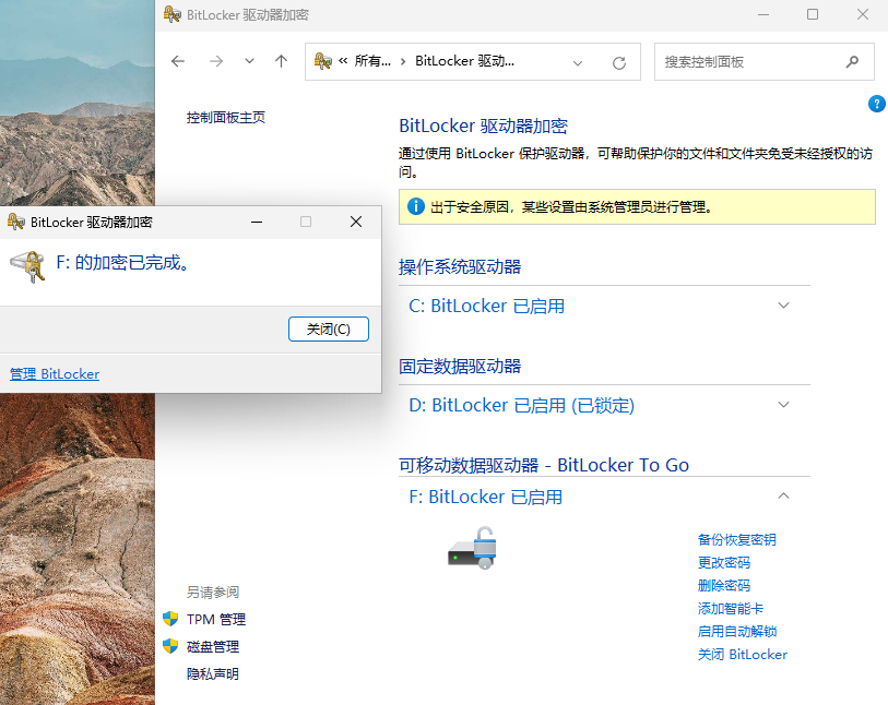 加密完成后系统会有提示,如提示不出来,在Bitlocker配置主界面也能看到状态,如下图所示,加密完成,Bitlocker已启用。