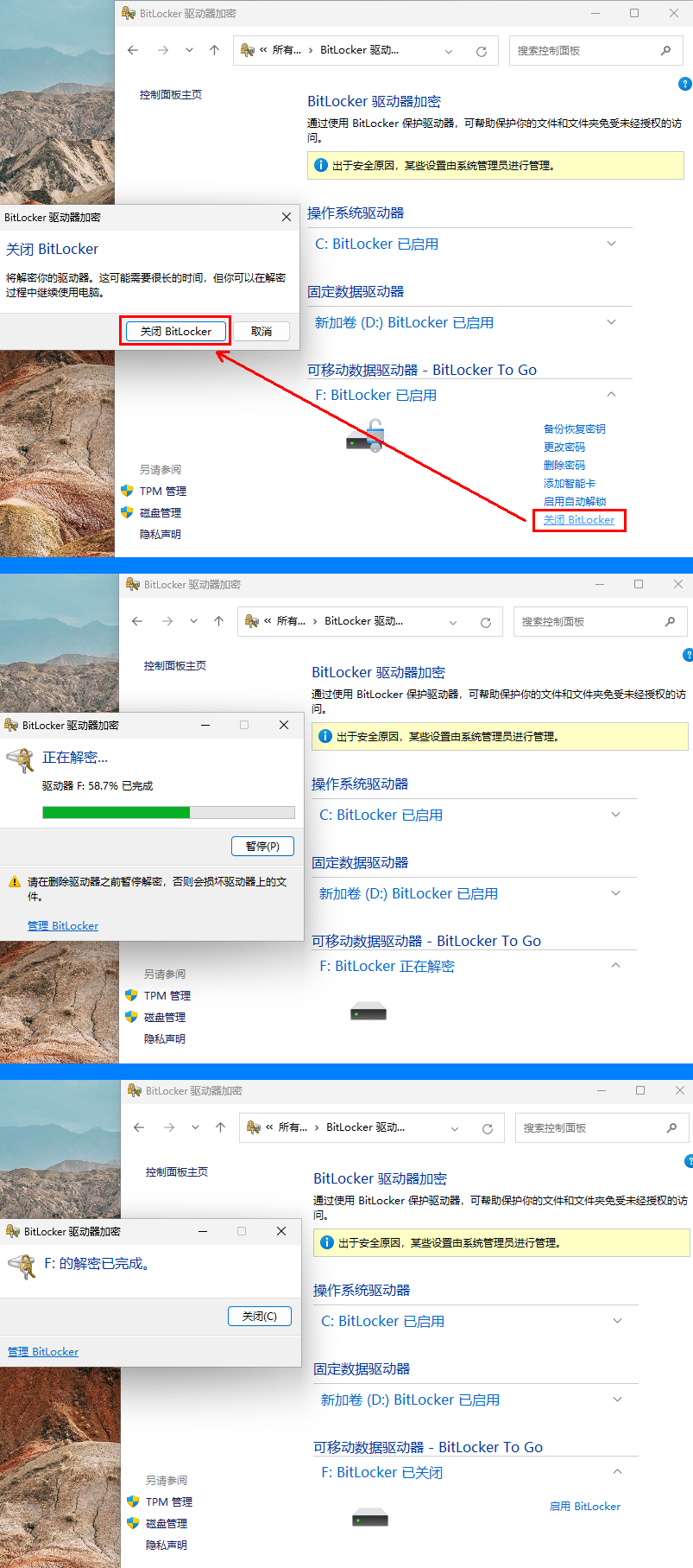 四、解密U盘,即关闭Bitlocker,使其变回普通的U盘使用。