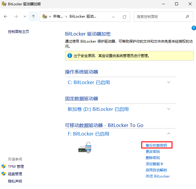 另外,如恢复密钥丢失,只要还记得解锁密码,均可解锁后在Bitlocker配置主界面进行重新导出。