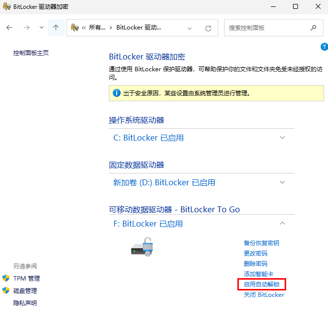 Bitlocker是Windows操作系统自带的功能,按下图操作即可打开其配置主界面,可查看所有分区的加密状态。启用为已加密,关闭为未加密。
